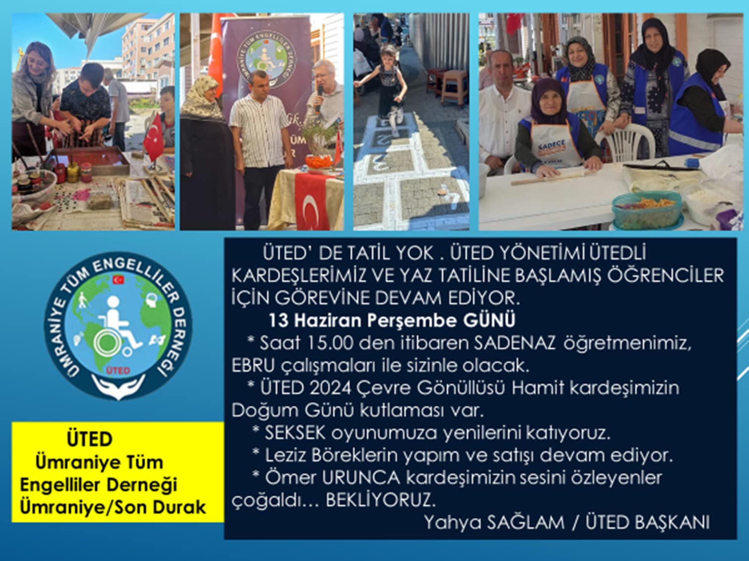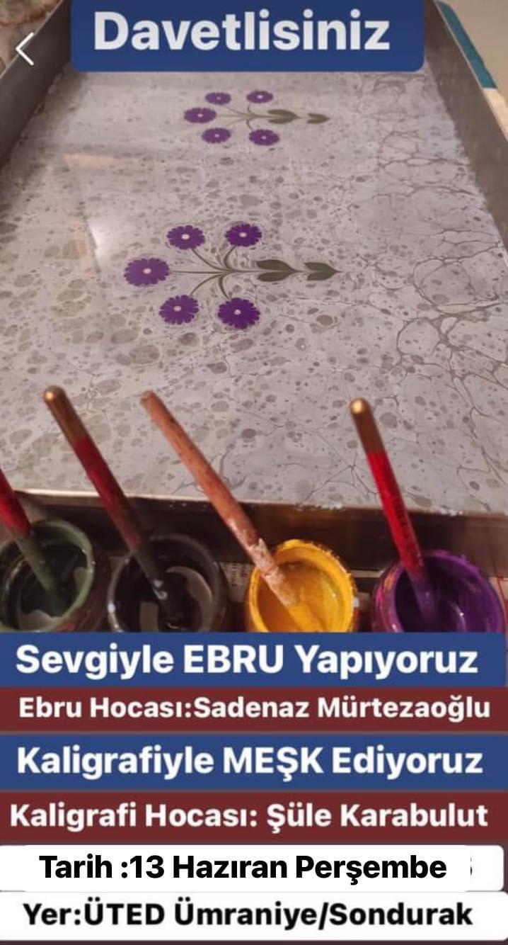 13 Hazıran günü saat 15-18 Ebru hocamız Sadenaz Mürtezaoğlu ile Sevgiyle EBRU Yapmaya Kalgrafi hocamız Şule Karabulut ile Kaligrafiyle MEŞK etmeye Davetlisiniz. ÜTED Sondurak/Ümraniye
